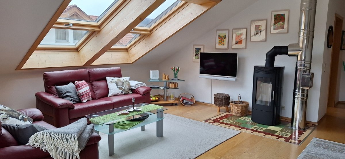 3-Zimmer-Wohnung im DG (75 m²) mit möbliertem Südbalkon, Sonnenmarkise und herrlichem Bergblick – auch durch zwei große Wohnzimmer-Dachfenster nach Westen.