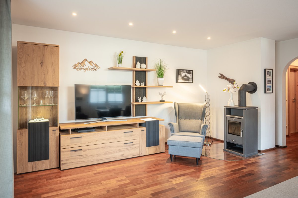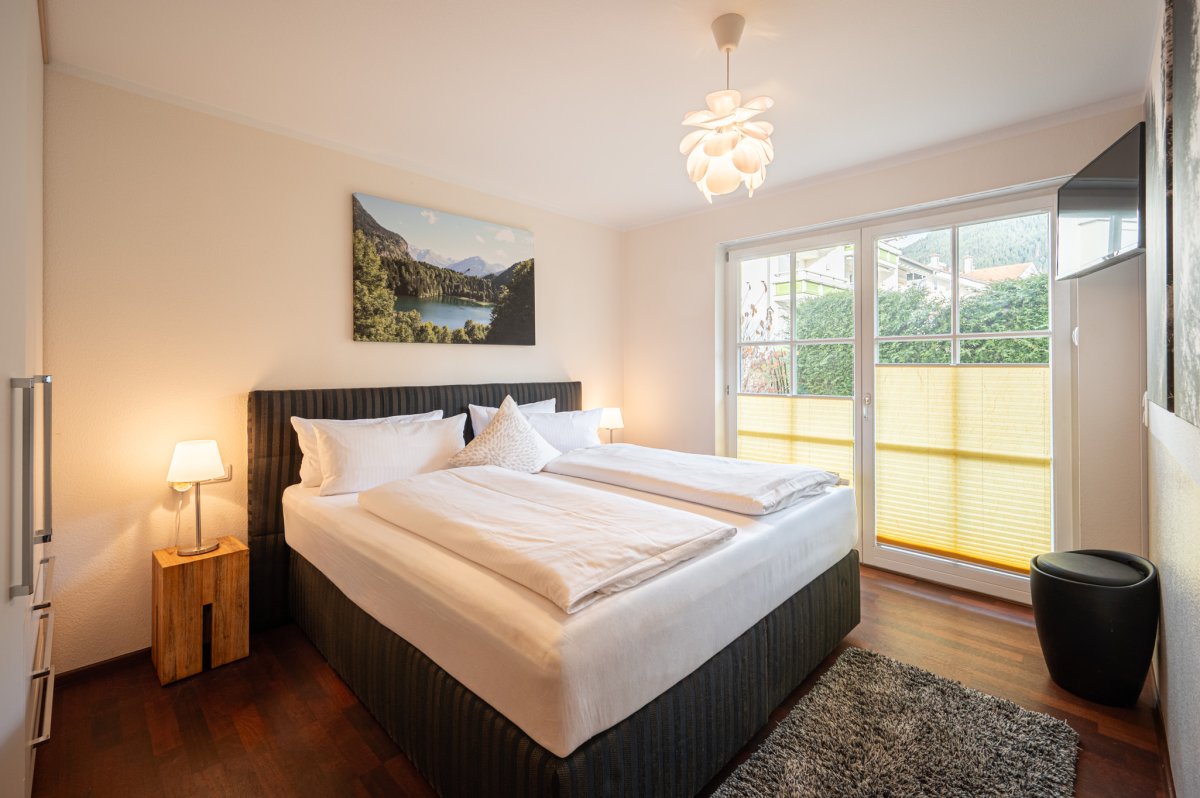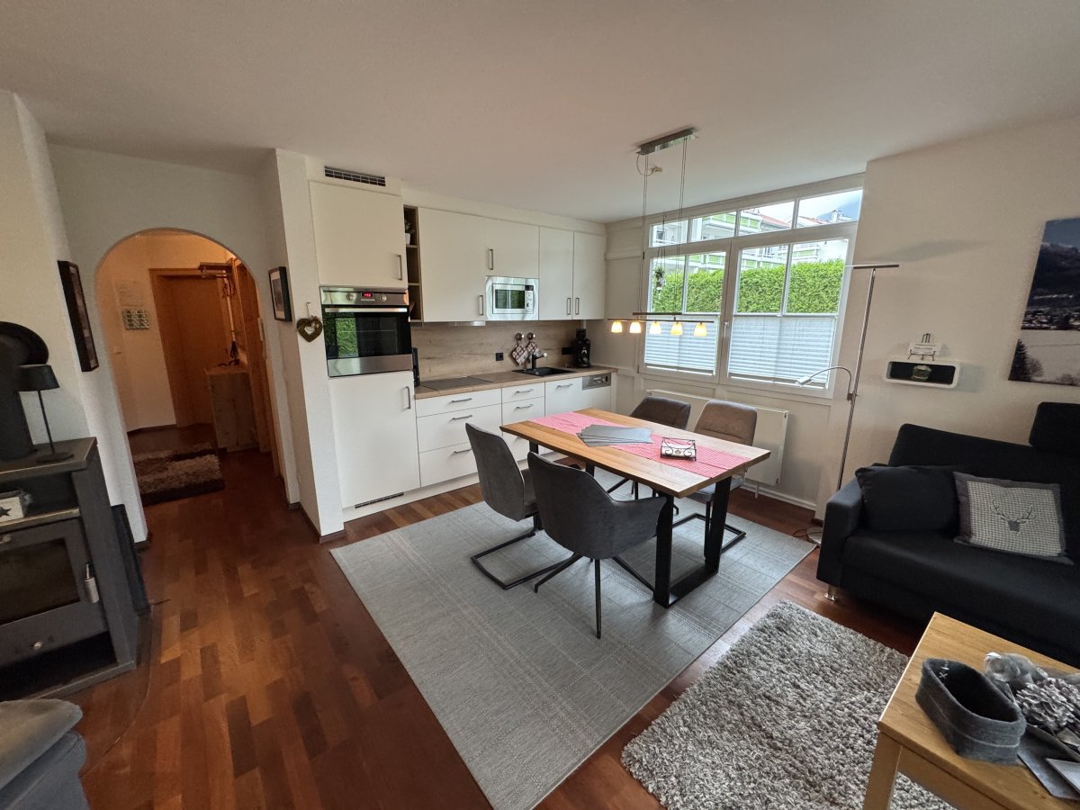 Wohnraum mit Couch, Essplatz und Küchenzeile mit Spülmaschine und Backofen, Schlafzimmer mit Doppelbett, 2. Schlafzimmer mit Einzelbett, Badezimmer mit bodentiefer Dusche, separates WC, Flur mit Garderobe, Smart-TV, Radio, WLAN, Südterrasse, Tiefgaragenplatz, Waschmaschine und Trockner im Keller, die geöffneten Bergbahnen können von Mai bis Oktober kostenlos vor Ort hinzugebucht und beliebig oft genutzt werden