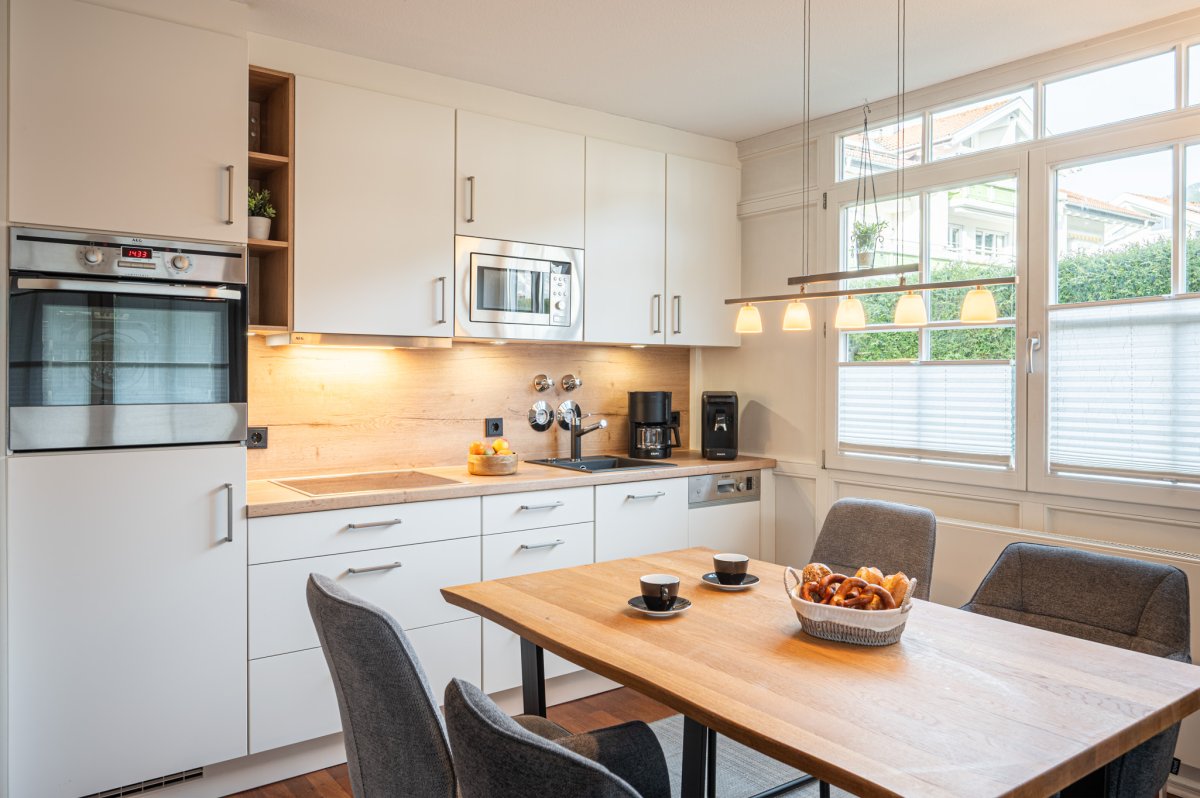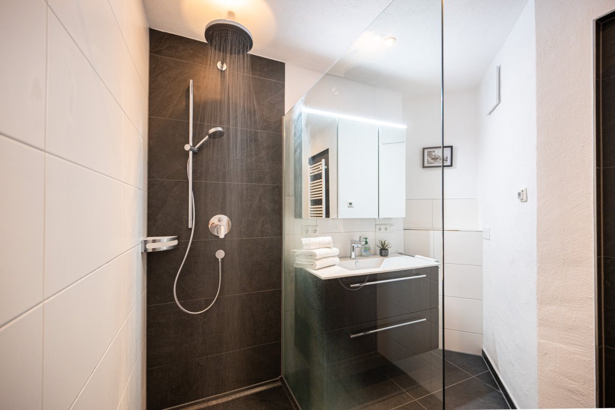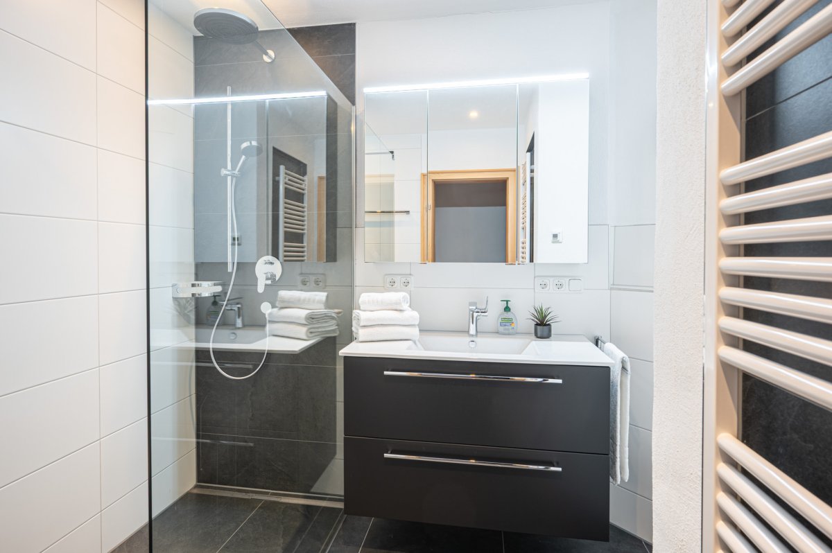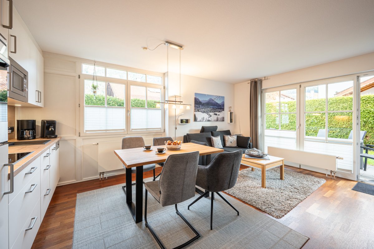 Wohnraum mit Couch, Essplatz und Küchenzeile mit Spülmaschine und Backofen, Schlafzimmer mit Doppelbett, 2. Schlafzimmer mit Einzelbett, Badezimmer mit bodentiefer Dusche, separates WC, Flur mit Garderobe, Smart-TV, Radio, WLAN, Südterrasse, Tiefgaragenplatz, Waschmaschine und Trockner im Keller, die geöffneten Bergbahnen können von Mai bis Oktober kostenlos vor Ort hinzugebucht und beliebig oft genutzt werden