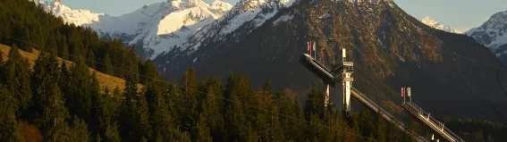 Bei einer Besichtigung können Sie mit dem Lift auf den Sprungturm zur Panorama-Plattform fahren. Von hier genießen Sie den einzigartigen Blick auf Oberstdorf und die umliegenden Berge. (Im Eintritt ist die Fahrt auf den Sprungturm wie auch der Besuch in unser Skimuseum, im Hauptgebäude, beinhaltet.)